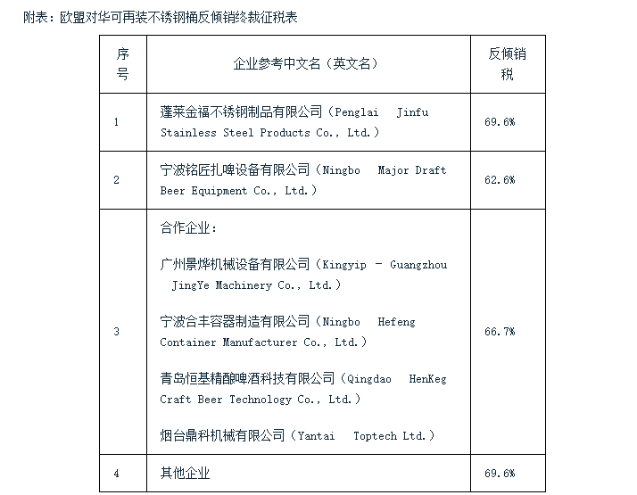 歐盟對(duì)華可再裝不銹鋼桶作出反傾銷(xiāo)終裁