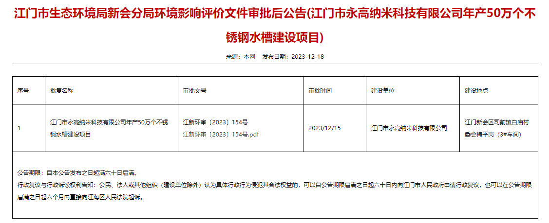 永高納米科技有限公司年產(chǎn)50萬個(gè)不銹鋼水槽建設(shè)項(xiàng)目環(huán)評獲審批